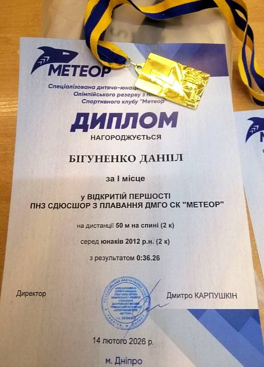 Вітаємо Даніїла Бігуненка, нашу зірочку, учня 7-А класу з перемогою (І місце) у змаганнях з плавання “Відкрита першість СДЮСШОР “Метеор”” на дистанції 50 м на спині та з призовим другим місцем на дистанції 100 м на спині.Пишаємося нашим спортсменом.