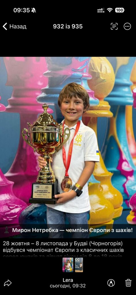 Юний дніпрянин Мирон Нетребка, вихованець ДЮСШ №9, здобув золото серед юнаків до 8 років, набравши неймовірні 9 очок із 9!
