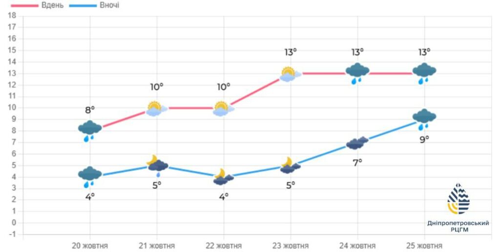 22-23 жовтня істотних опадів не прогнозується, вітер змінить напрямок з південно-західного на південно-східний, надходитиме більш тепла повітряна маса.