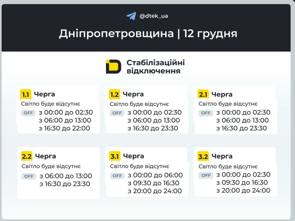 У Дніпрі та області завтра, 12 грудня, знову відключатимуть електроенергію. Про це повідомляє Дніпро Регіон з посиланням на ДТЕК.