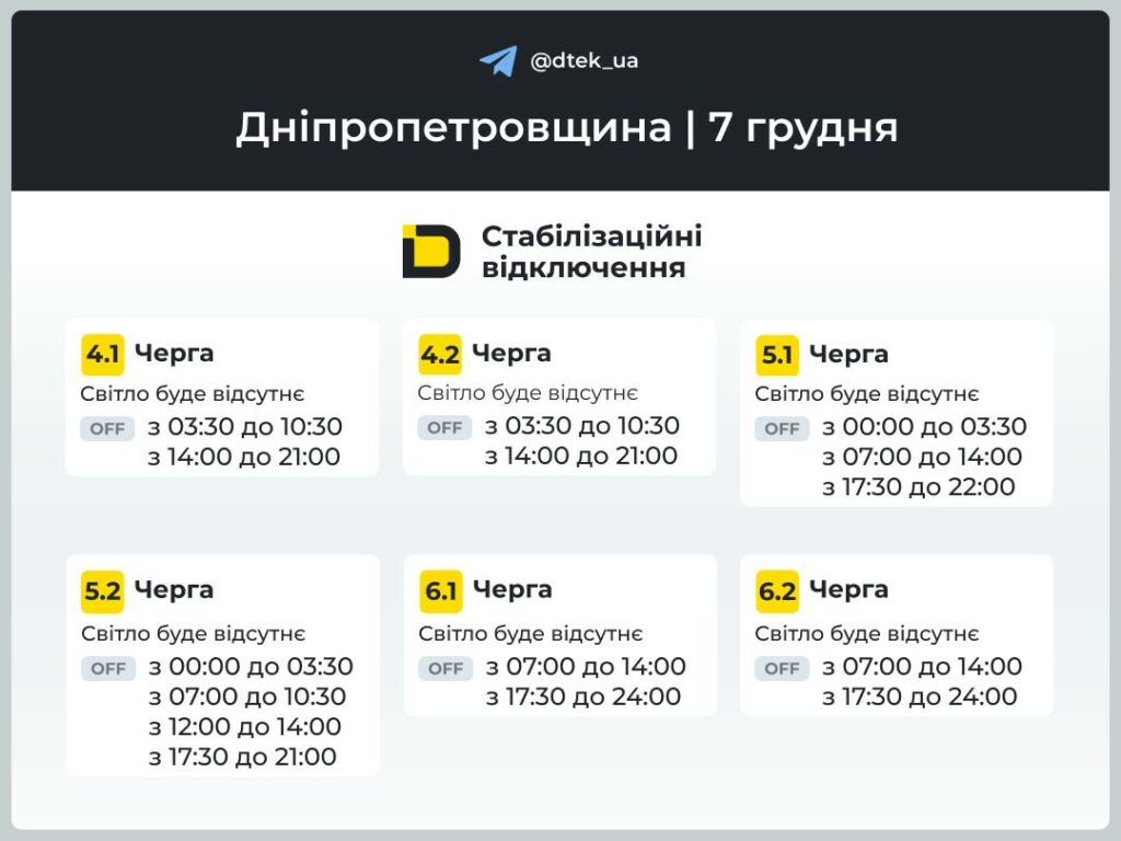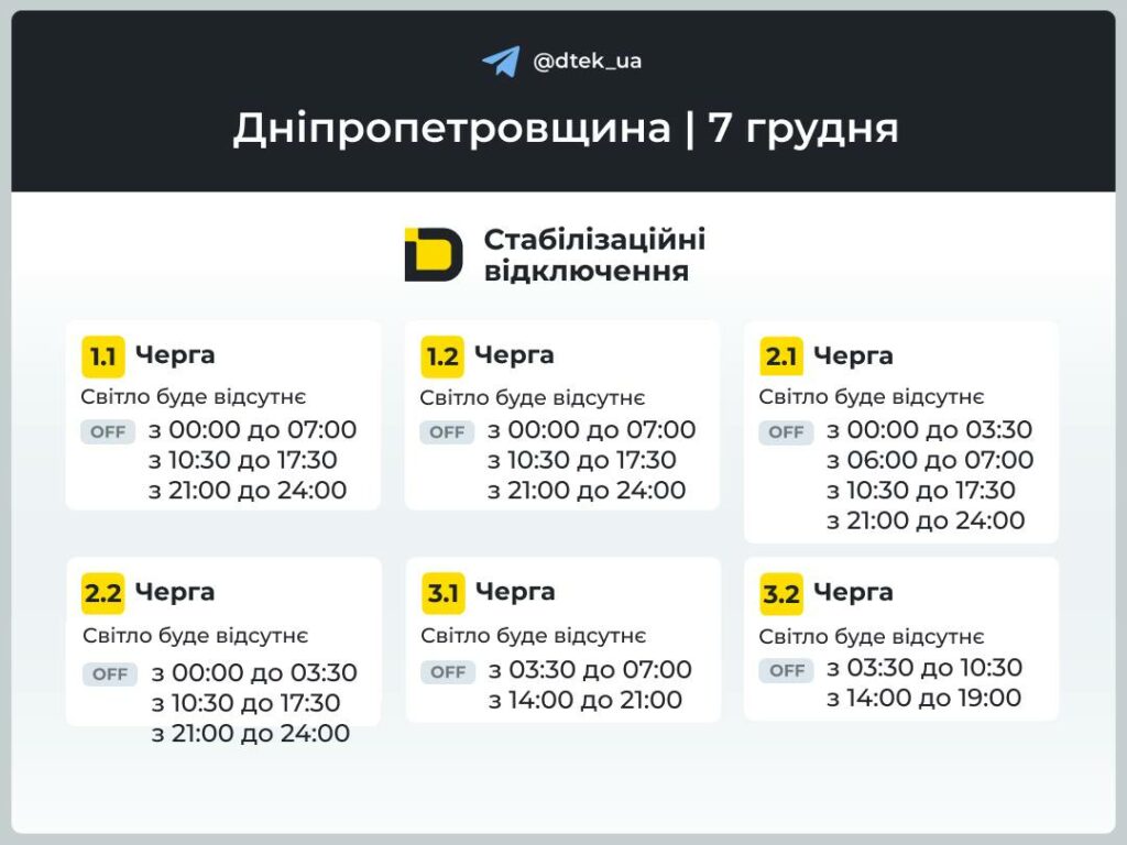 У Дніпрі завтра, 7 грудня, знову буде застосовуватись погодинне відключення електроенергії. Про це повідомляє Дніпро Регіон з посиланням на ДТЕК. Як відключатимуть світло в Дніпрі та області 7 грудня Якщо ви знайшли помилку, будь ласка, виділіть фрагмент тексту та натисніть Ctrl+Enter. 0 0 голоси Рейтинг статті Раніше ми писали: ЦЕК 7 грудня. Будуть діяти погодинні відключення електроенергії в Дніпрі та області ДТЕК 7 грудня. У Дніпрі погодинне відключення світла по графіках У Дніпрі внаслідок ворожого удару згорів центральний склад аптечної мережі Відключення світла Графік відключення світла від ДТЕК Новини Дніпра