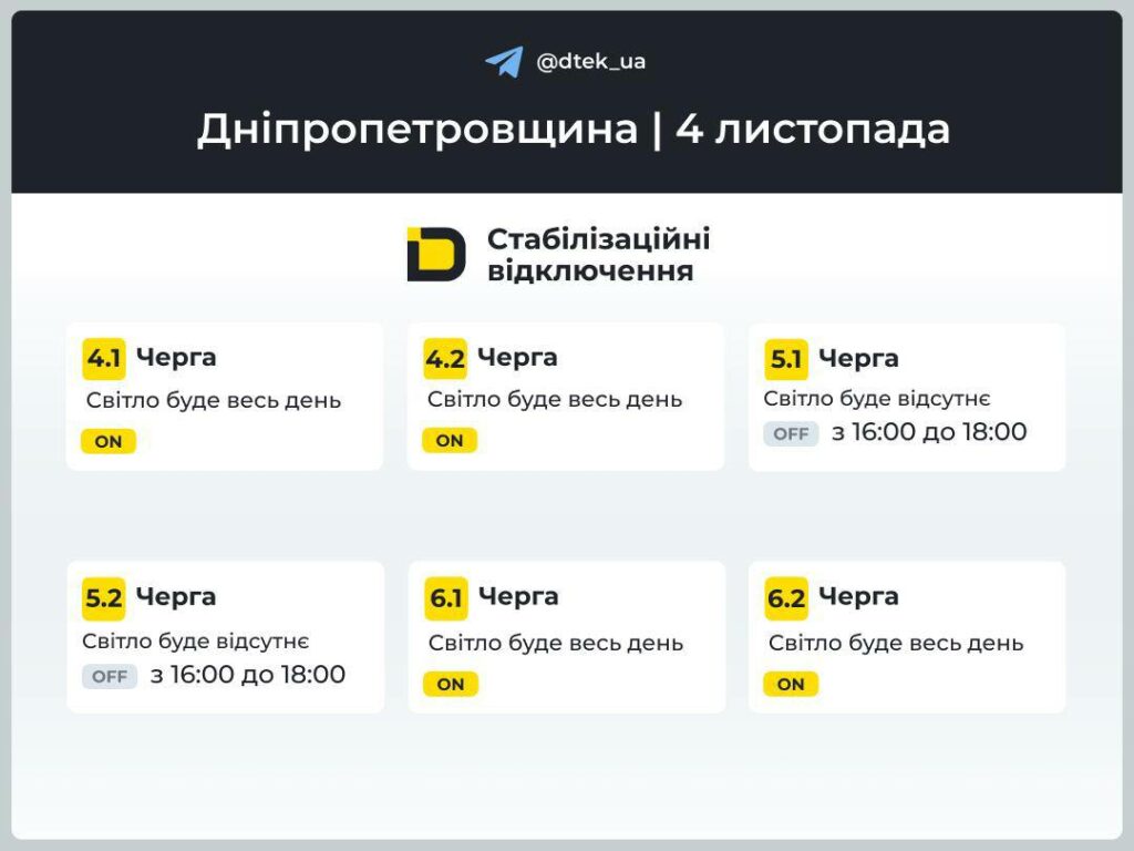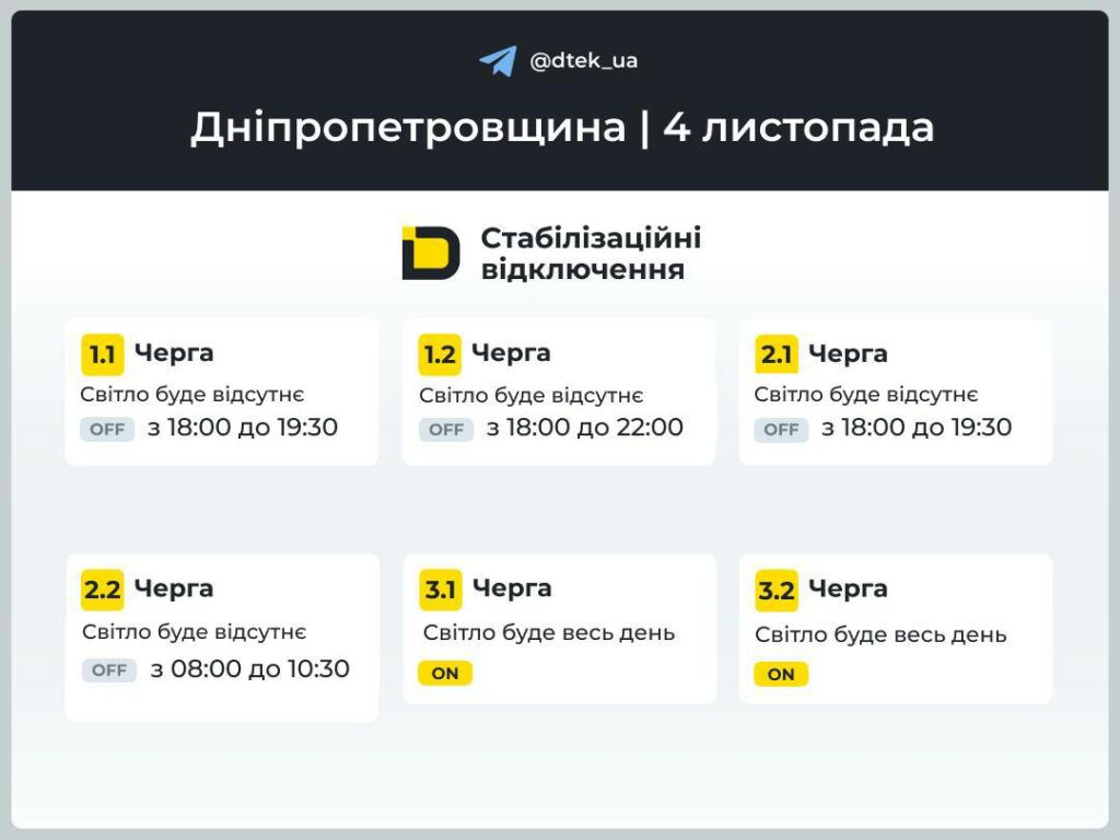 ДТЕК. Графіки відключення світла в Дніпрі та області 4 листопада