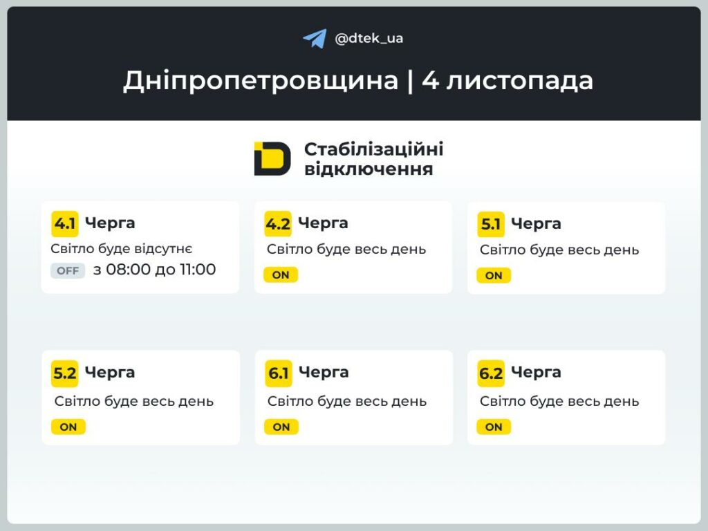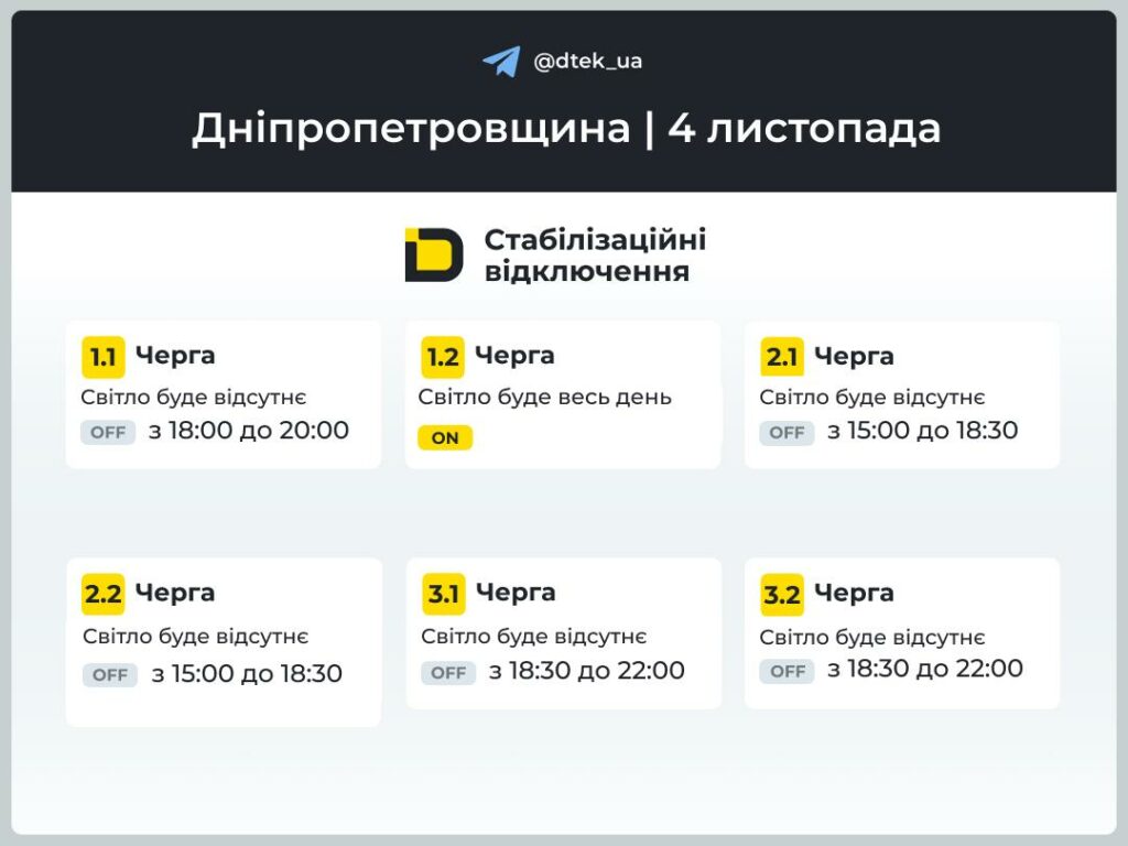 Дніпропетровщина: оновлені графіки відключень на 4 листопада. Про це повідомляє Дніпро Регіон з посиланням на енергетичну компанію ДТЕК. ▪️ В разі змін, будемо оперативно вас інформувати у нашому телеграм-каналі. Якщо ви знайшли помилку, будь ласка, виділіть фрагмент тексту та натисніть Ctrl+Enter. 5 1 голос Рейтинг статті Раніше ми писали: ДТЕК. Оновлені графіки відключення електроенергії в Дніпрі 4 листопада Відключення електроенергії споживачам ЦЕК в Дніпрі та області 4 листопада ДТЕК. Графіки відключення світла в Дніпрі та області 4 листопада Відключення світла Графік відключення світла від ДТЕК Новини Дніпра