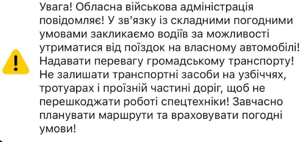Перш за все, інформація стосується водіїв. Їх просять через складні погодні умови за можливості утриматись від поїздок на власному авто, не залищати вашини на узбіччях, тротуарах.
