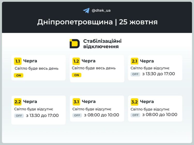 Через масовану атаку на енергетичну інфраструктуру країни за розпорядженням Укренерго, у Дніпрі 25 жовтня будуть діяти погодинні відключення світла. Компанія ДТЕК опублікувала ГПВ, який буде застосовуватися для населення, повідомляє Дніпро Регіон.