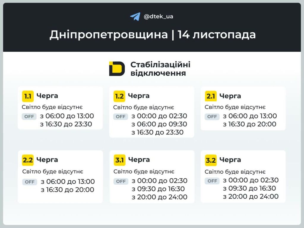 Як у Дніпрі та Дніпропетровській області завтра, 14 листопада, відключатимуть електроенергію. Про це повідомляє Днпіро Регіон з посиланням на ДТЕК. Графіки відключень на 14 листопада Якщо ви знайшли помилку, будь ласка, виділіть фрагмент тексту та натисніть Ctrl+Enter. 0 0 голоси Рейтинг статті Раніше ми писали: ЦЕК. Графіки відключення електроенергії 14 листопада в Дніпрі та області Поліція Дніпропетровщини розшукує 12-річну Альону Гелю Графіки відключень електроенергії ДТЕК в Дніпрі та області 14 листопада Відключення світла Графік відключення світла від ДТЕК Новини Дніпра