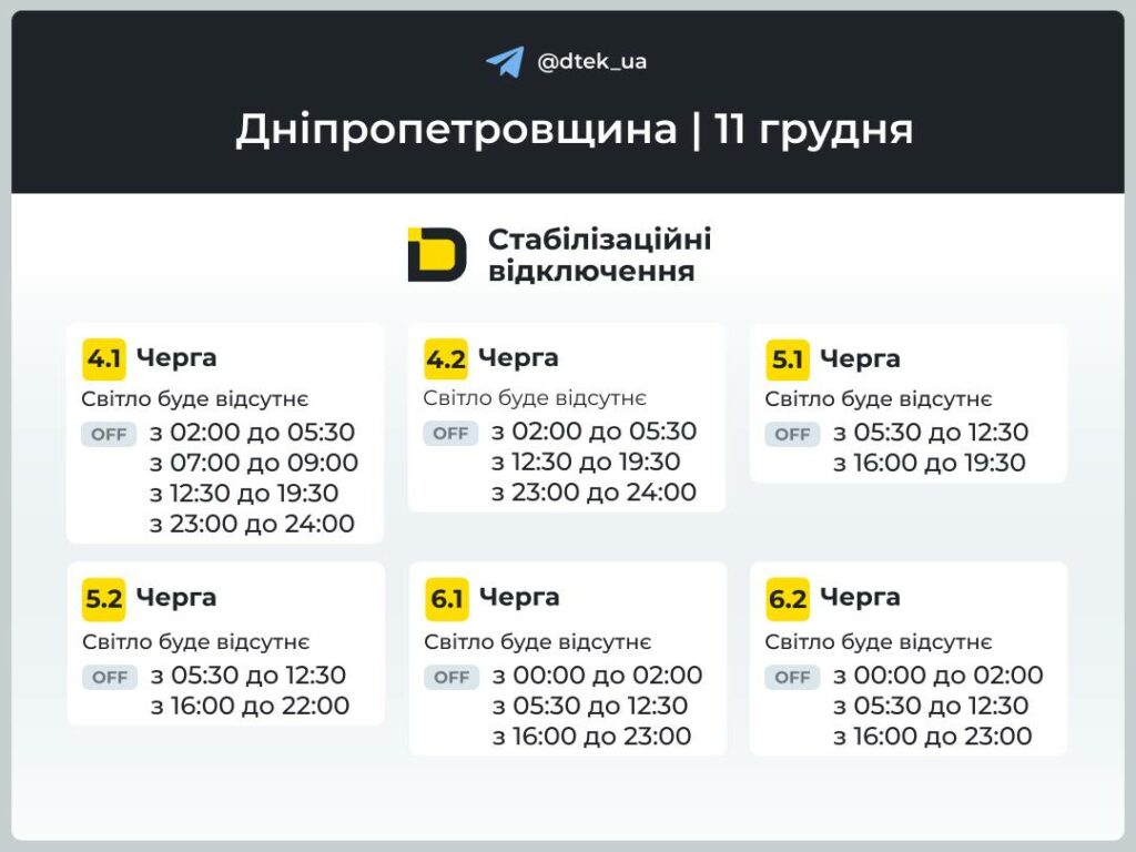 Графіки відключення ДТЕК 11 грудня в Дніпрі та області
