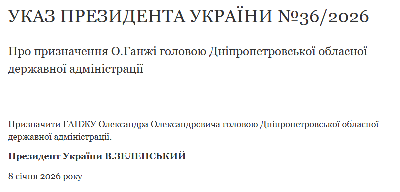 Новим очільником Дніпропетровської обласної військової адміністрації став Олександр Ганжа. Відповідний указ оприлюднили на сайті президента. Про це повідомляє Дніпро Регіон з посиланням на Уках президента.