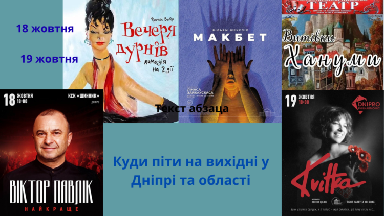 Дніпро Регіон зібрав для вас найцікавіші події на цих вихідних як у Дніпрі так і в області: концерти, спектаклі, виставки та інші тематичні заходи. Дізнайтеся, де пройдуть концерти, які вистави покажуть у театрі, та куди піти з дітьми .