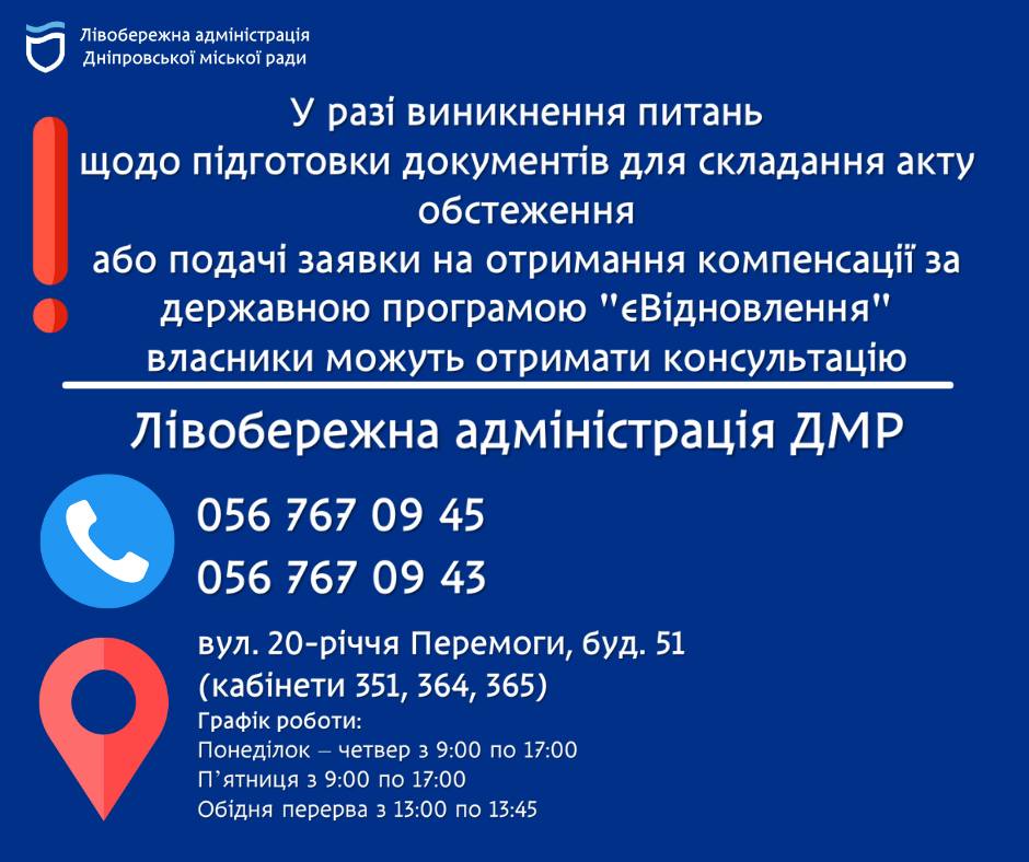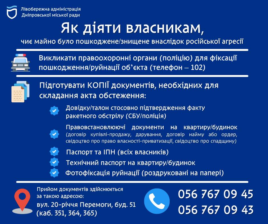 Власники житла та іншого майна у Дніпрі, які постраждали внаслідок ворожої агресії 10 жовтня, мають негайно розпочати процес фіксації пошкоджень для отримання компенсації. Лівобережна адміністрація оприлюднила детальний алгоритм дій.