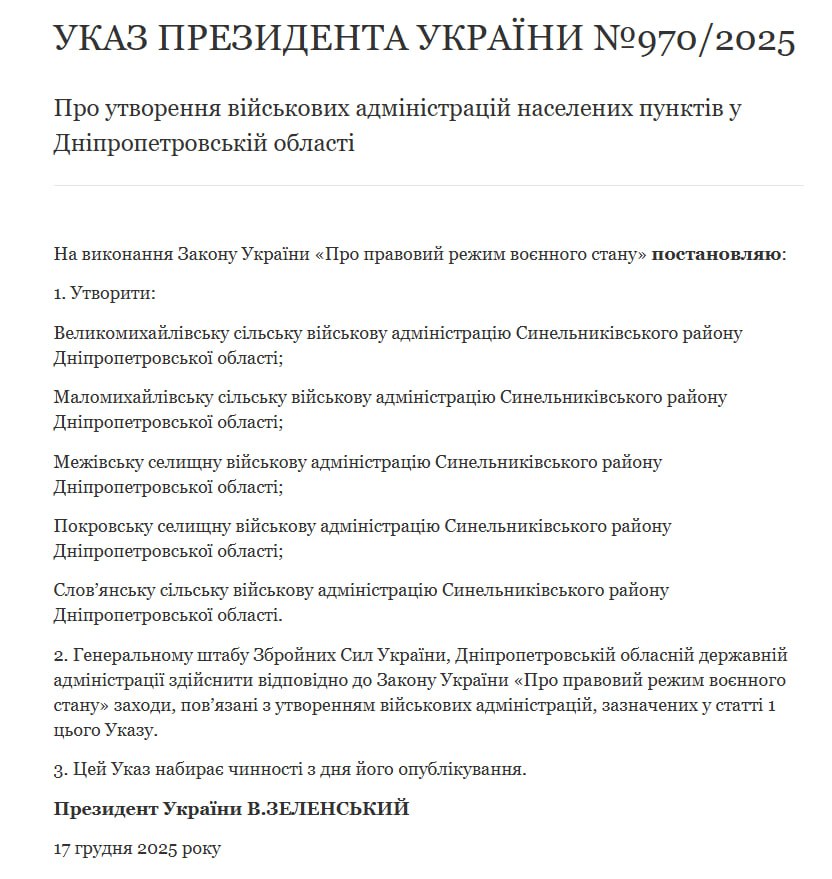 В Синельниківському районі Дніпропетровщини створили 5 військових адміністрацій. Про це повідомляє Дніпро Регіон з посиланням на указ Президента України.
