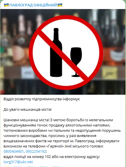 У Павлограді міська влада звернулася до місцевих з проханням повідомляти про точки продажу тютюну та алкоголю. Про це повідомляє Дніпро Регіон з посиланням на Павлоградську міську раду.