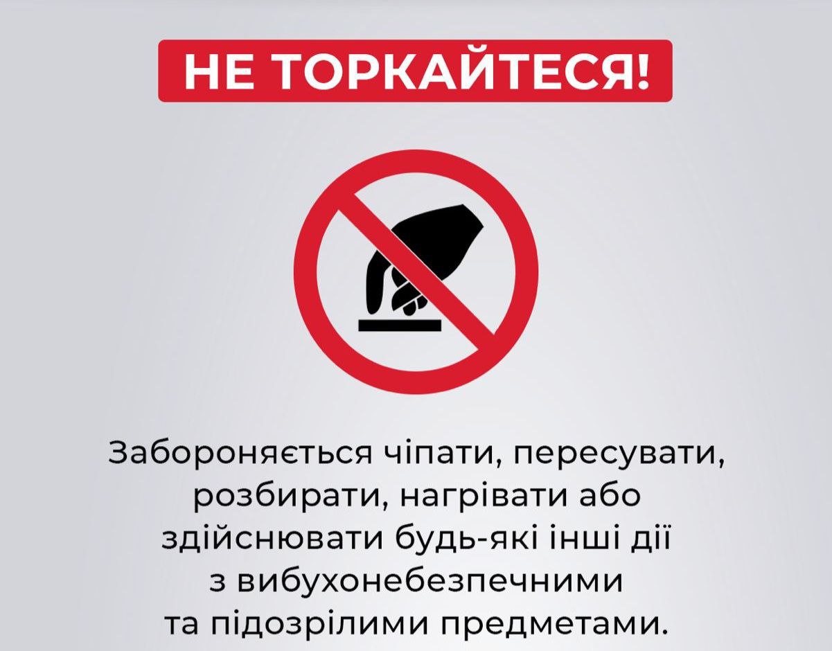 Не торкайтеся або не переміщуйте предмети, які вам незнайомі і які можуть бути вибухонебезпечними.