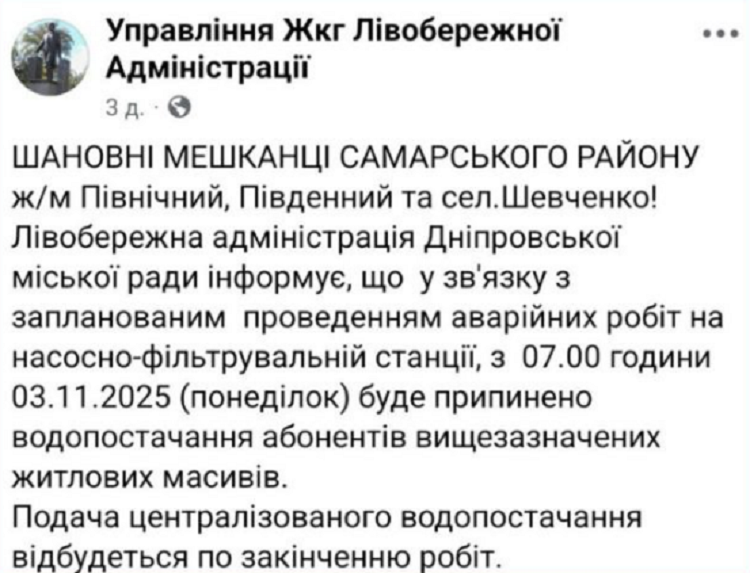 У Дніпрі у понеділок, 3 листопада, тимчасово припинять водопостачання на ж/м Північний, Південний та у селищі Шевченко. Про це повідомляє Дніпро Регіон з посиланням на Лівобережну адміністрацію.