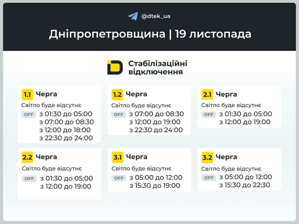 Дніпропетровщина: оновлені графіки відключень на 19 листопада. Про це повідомляє Дніпро Регіон з посиланням на ДТЕК. В разі змін, будемо оперативно вас інформувати. Стежте за нашими повідомленнями та новинами. Якщо ви знайшли помилку, будь ласка, виділіть фрагмент тексту та натисніть Ctrl+Enter. 2.5 2 голоси Рейтинг статті Раніше ми писали: Ворожа атака по Дніпропетровщині. Населений пункт залишився без світла Під білим покривалом. Дніпропетровщину засипає снігом Вибухи на Дніпропетровщині 19 листопада. Мешканців просять зберігати спокій