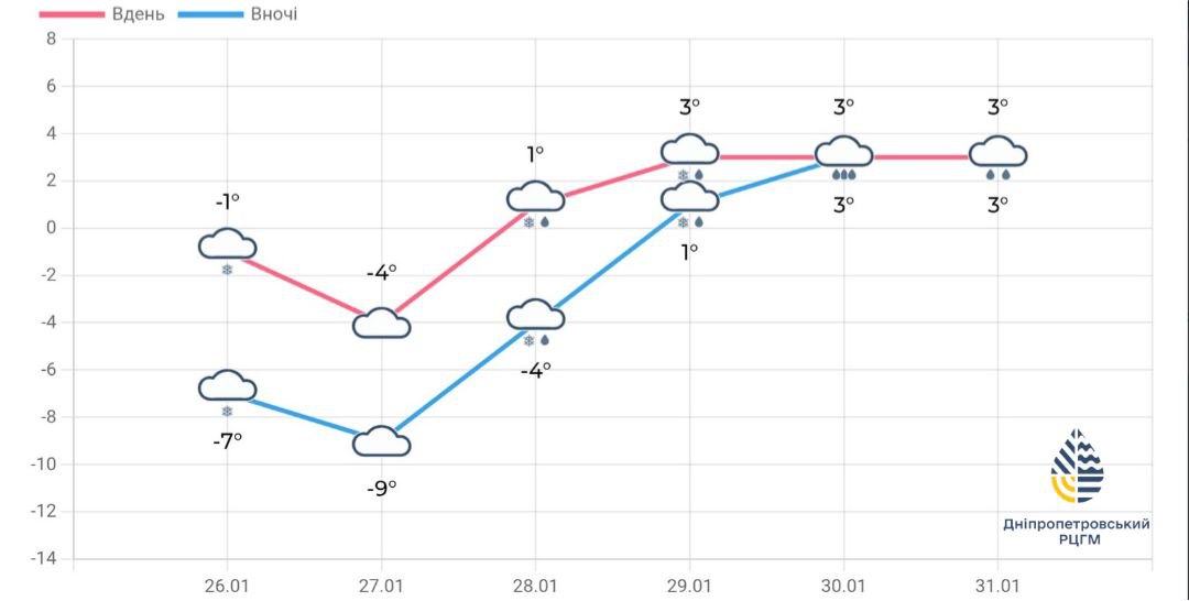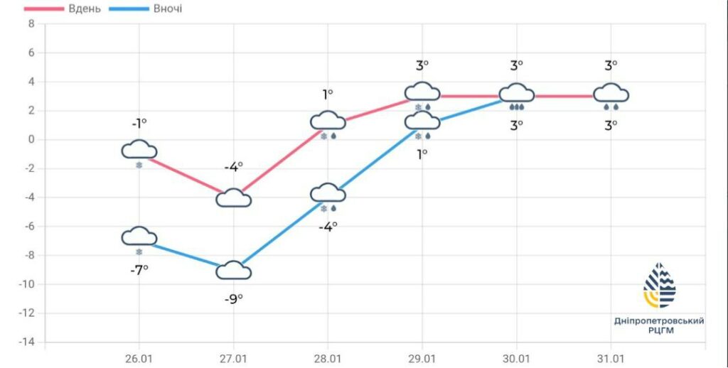 Очікується поступове послаблення морозів: вночі до -8..-13°, вдень до 0..-5°. Місцями можливий слабкий сніг.