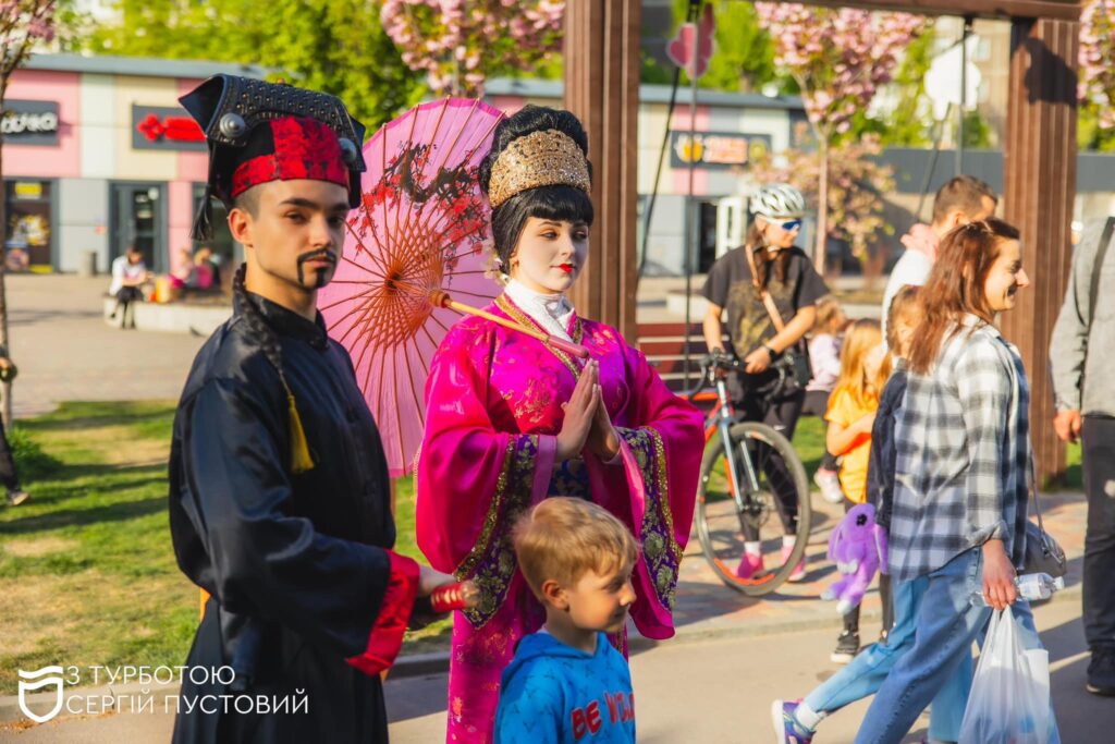 Тож органічною стала поява яскравих «японців» в сквері у неділю, тематична музика та мультфільм з країни сонця, яке сходить.Вийшло атмосферно.Дякуємо хлопцям з клубу японського фехтування, які підтримали наш двіж.