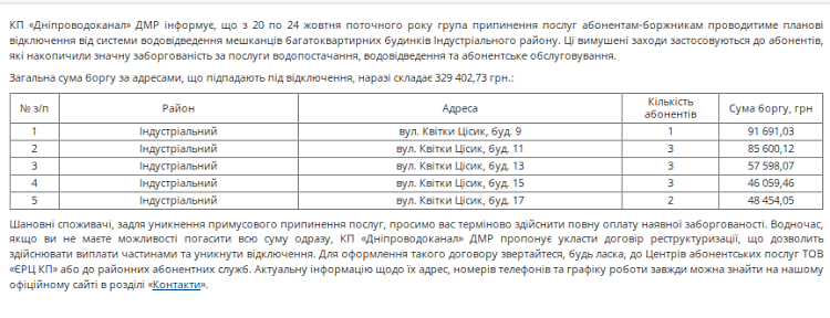 За інформацією підприємства, роботи проведуть у багатоквартирних будинках Індустріального району. Загальна сума боргу споживачів, що потрапили до списку відключень, становить 329 402,73 грн.