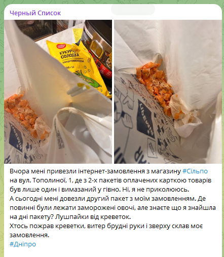 “Вчора мені привезли інтернет-замовлення з магазину Сільпо на вул. Тополиної, 1, де з 2-х пакетів оплачених карткою товарів був лише один і вимазаний у гівно. Ні, я не приколююсь.