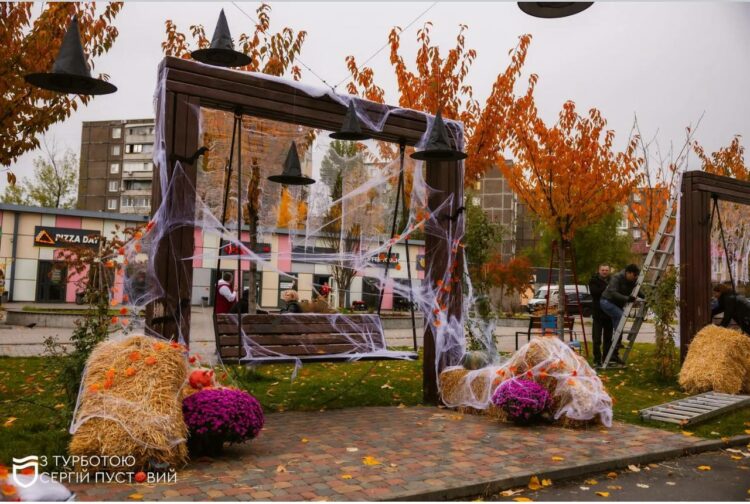 Павутиння обвиває арки й паркани, а вздовж доріжок розкидані примари, сінні інсталяції, квіти й гарбузові шедеври від учасників креативного конкурсу.