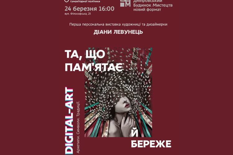 24 березня о 16:00 у Дніпрі відбудеться відкриття першої персональної виставки художниці та дизайнерки Діани Левунець, повідомляє «Дніпро Регіон» з посиланням на Дніпровський будинок мистецтв.