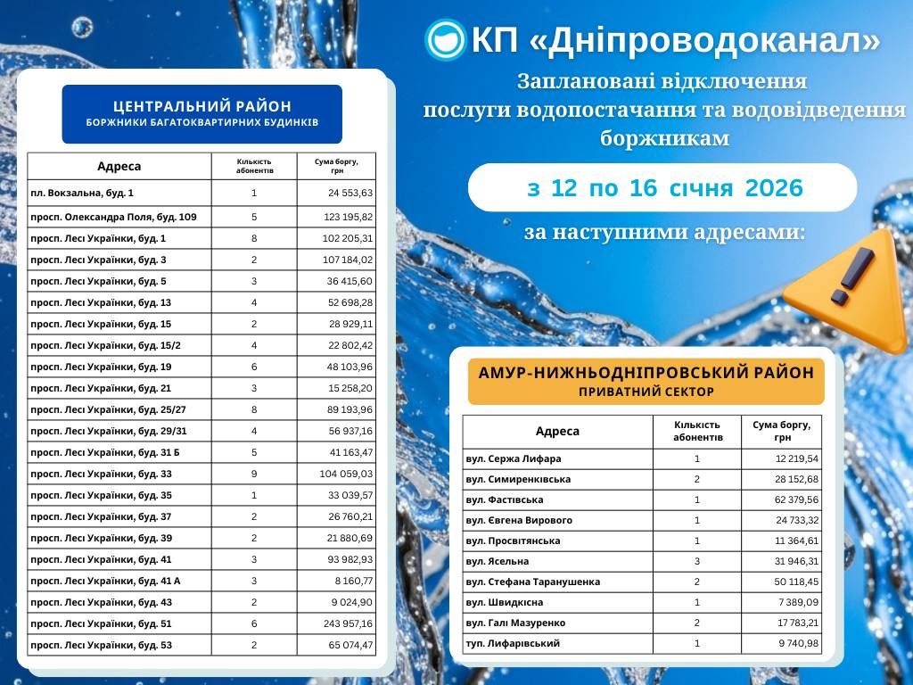 З 12 по 16 січня 2026 року спеціалізована бригада КП «Дніпроводоканал» ДМР виконуватиме роботи з тимчасового відключення водопостачання та водовідведення боржників.