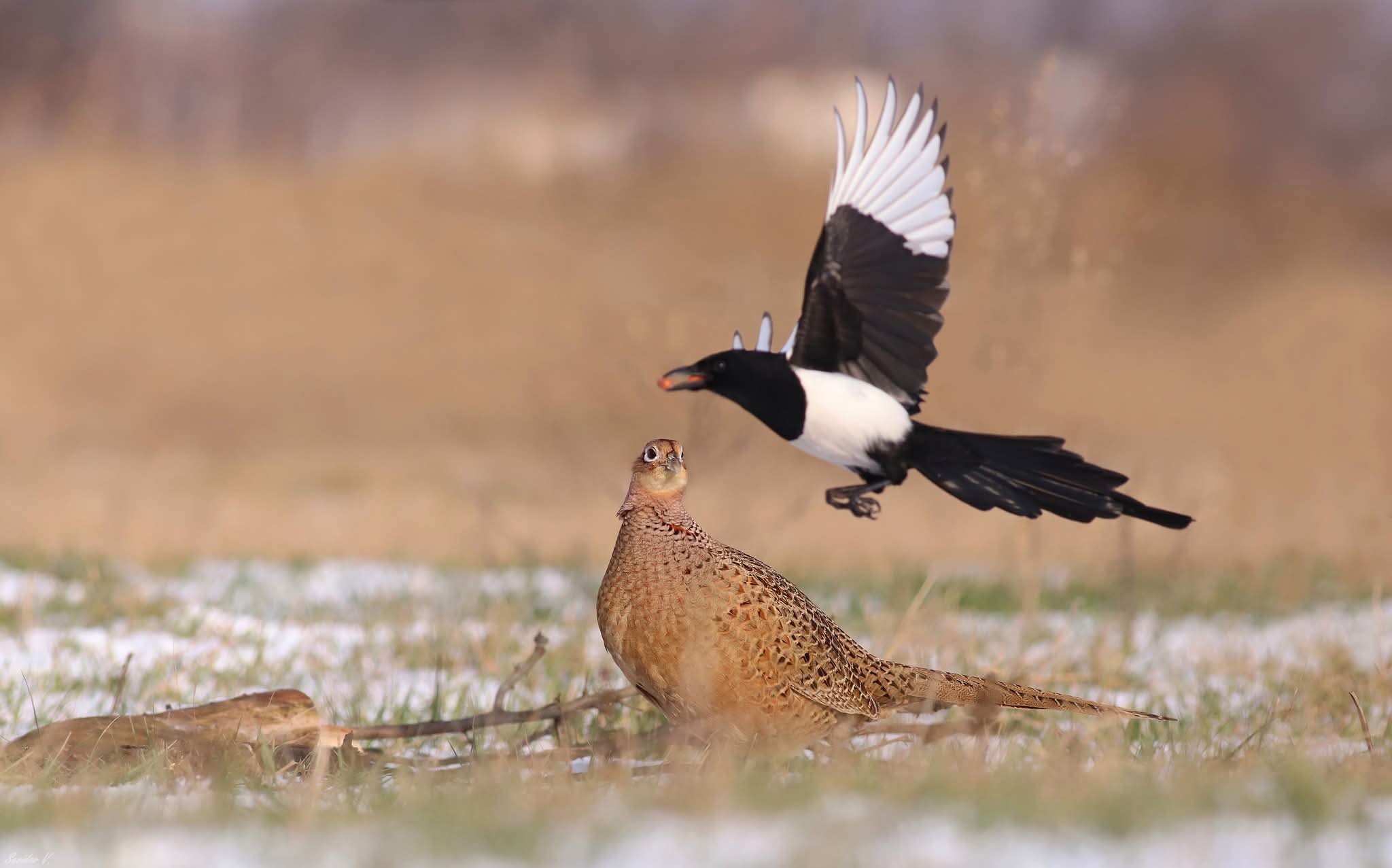 Біологічна особливість чи просто кепський характер? Сороки відомі своєю допитливістю, але цей екземпляр перейшов усі межі ввічливості. Об’єктом її особливої уваги стали довгі хвости фазанів. Сорока терпляче вичікує момент, аби вщипнути опонента, провокуючи птахів на реакцію.