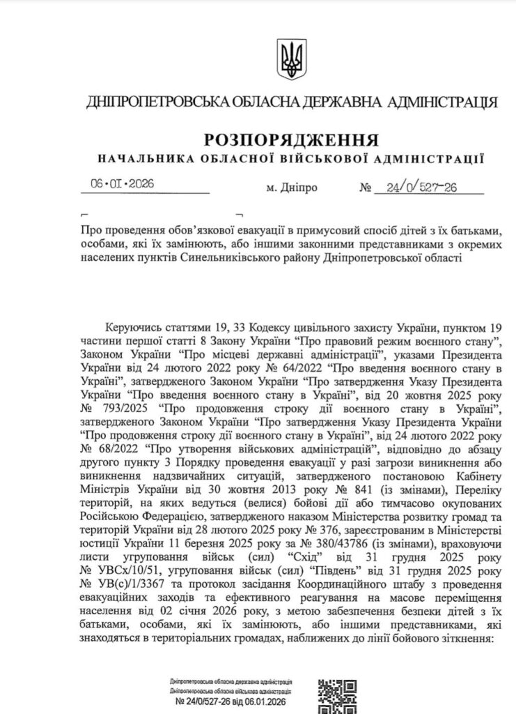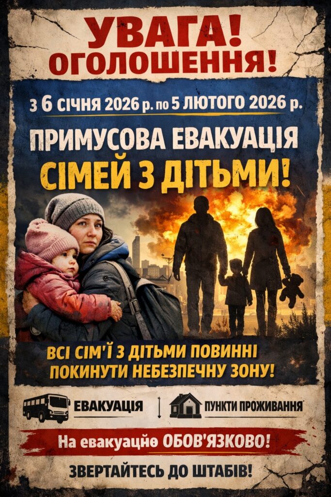 Евакуація проводиться разом із батьками або законними представниками протягом 30 днів, до 05 лютого 2026 року.