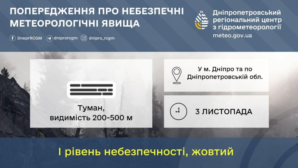 3 листопада вночі та вранці у м. Дніпро та по Дніпропетровській області очікується туман. Видимість в тумані 200-500 м.