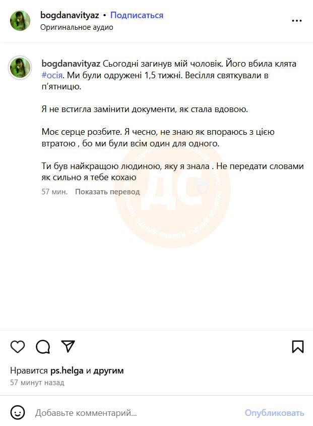 «Я не встигла замінити документи, як стала вдовою. Моє серце розбите. Я чесно, не знаю як впораюся з цією втратою. Бо ми були всім один для одного. Ти був найкращою людиною, яку я знала», – написала дружина загиблого чоловіка.